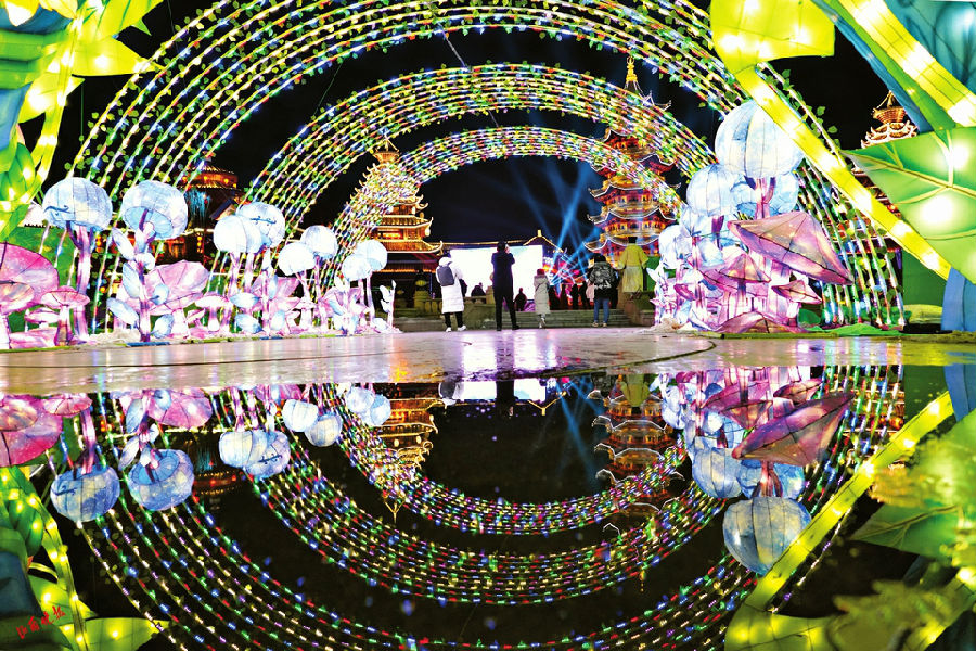雪后地上的一攤積水,倒映著彩燈拱門,形成別樣的場景。