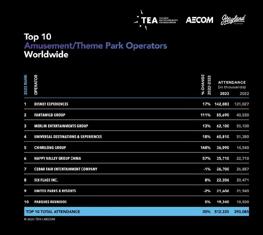 作為自2019年以來該榜單的首次重新排名,TEA和AECOM在報告中指出,隨著疫情退去,全球景點行業穩定前行,邁向未來,各個地區的游客量已經全部接近或超過了2019年水平。2023年全球前十大主題樂園的年游客接待量總體同比大幅增長30%,達到5.12億人次,與2019年5.21億人次幾乎持平。