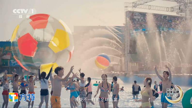 在央視的一分鐘宣傳片中,華強方特通過讓動漫明星熊大、熊二化身球員,方特化身“足球場”,吸引眾多游客歡樂互動,感受體育競技的魅力。而走進方特主題樂園,游客不僅可以看到掛滿球隊旗幟的鮮花大道,活力十足的足球寶貝,還可以親身參與到“嗨啤世界杯”、“水球運動會”等系列足球活動中,狂歡一夏