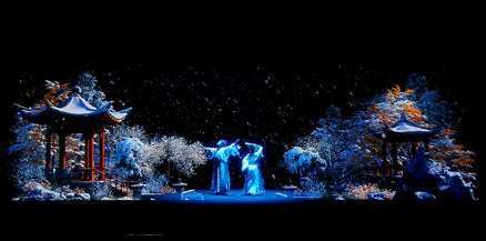 《梁山伯與祝英臺》的舞臺四面通透,觀眾從任何方向都可以看到舞臺上的場景。表演開始后,觀眾能觀賞到演員和舞臺場景神秘地消失,四面墻壁在通透的舞臺上憑空出現,藤蔓植物在墻壁上快速生長,以及墻面碎裂、崩塌等震撼效果。同時,舞臺營造的風、雪、雷、電等天氣變化都能帶給觀眾最接近真實的觀感體驗。表演接近尾聲時,梁山伯與祝英臺翩翩起舞,最后化身為美麗的蝴蝶飛入花叢,凄美絢爛。整場表演看罷,如詩如畫。《梁山伯與祝英臺》就這樣以真實、夢幻、凄美的效果向觀眾訴說著“為愛化蝶”的千古愛情悲劇。