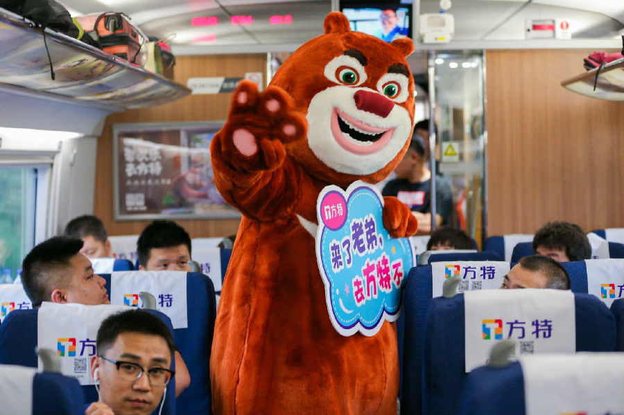 不僅如此,方特原創動漫IP“熊出沒”人偶還現身車廂,它們不時向旅客派發小禮物,展現萌趣可愛的造型與動作,吸引眾多旅客拍照合影和積極互動,并刷屏社交媒體。有旅客表示:“這條(高鐵)線路上有好幾座方特主題樂園,現在孩子剛好在放暑假,有機會的話一定會帶著孩子就近到方特主題樂園體驗?!?/p>